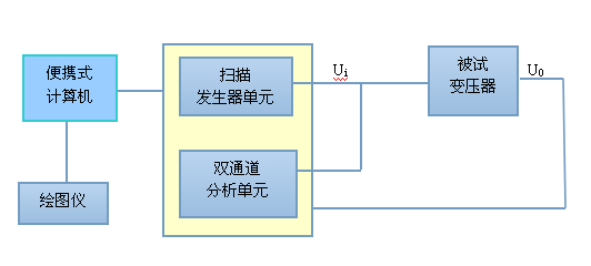 首先,计算机发出命令,让扫描发生器单元输出一系列频率的正弦波电压,加到被试变压器上;同时让双通道分析单元分析、处理Ui、U0信号,并传送到计算机存贮起来;待试验数据采集完毕后,计算机判断被试变压器有无绕组变形,并可以屏蔽显示或绘制被试变压器频响特性曲线。